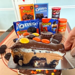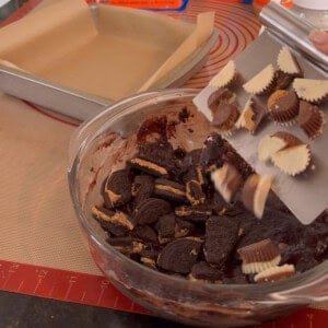 - 1 box Reese’s or Oreo brownie mix plus ingredients listed on box
