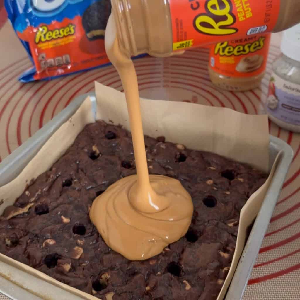 - Melt Reese’s peanut butter until fully fluid. Pour over brownies and tap pan gently to help it settle into the holes. Refrigerate until set.