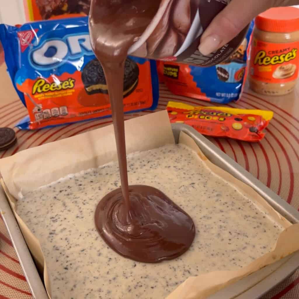 - Melt cookies & cream spread until pourable. Spread evenly over the peanut butter layer. Refrigerate again until firm.